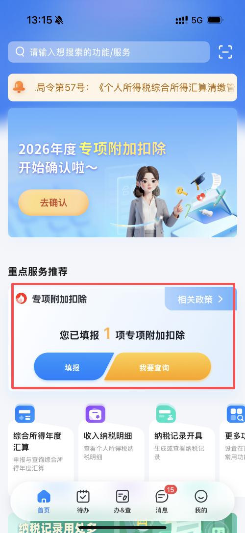 4. 若需新增扣除项目,在APP内找到【专项附加扣除填报】模块,选择要新增的项目类型,扣除年度选择“2026”,然后按照系统提示逐步填写相关信息即可。