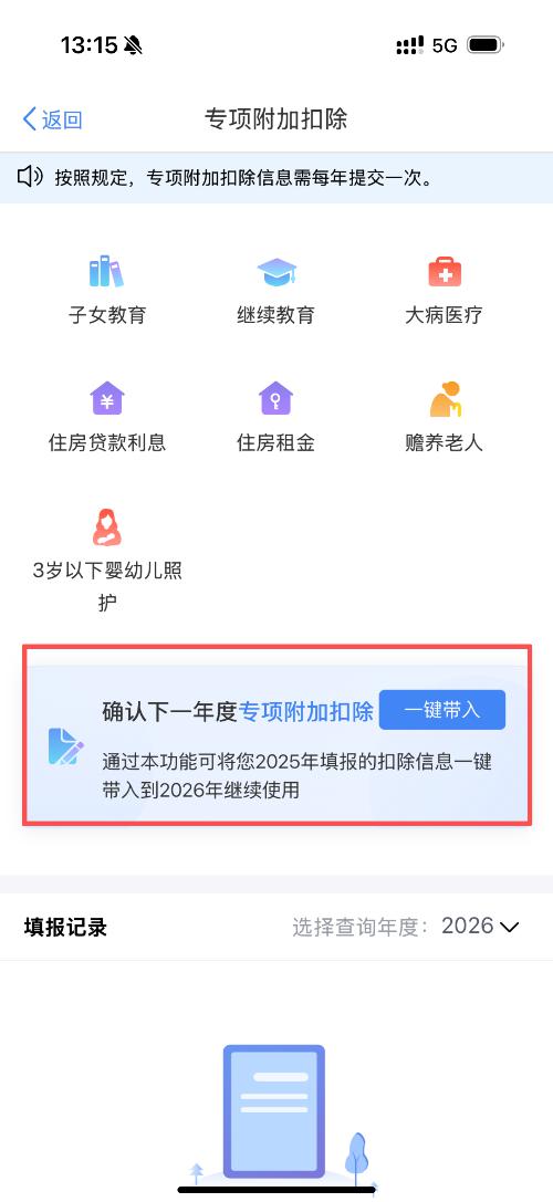 2. 若2026年的专项附加扣除信息与2025年相比没有变化,直接点击【一键带入】按钮,即可完成信息确认,无需额外操作。