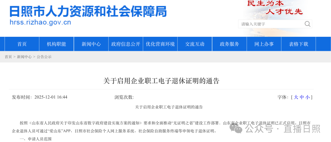 自2025年12月1日起,参加企业职工基本养老保险、持有社会保障卡且养老保险待遇发放状态正常的日照市退休人员,可申领电子退休证明。