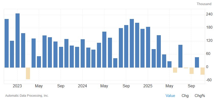 12月3日周三美股盘前,美国自动数据处理公司(ADP)发布的数据显示,11月美国私营部门就业岗位减少3.2万个,这一降幅规模上次出现还是在2023年3月,此前市场普遍预期为增加1万个,而10月该数据为增加4.7万个。