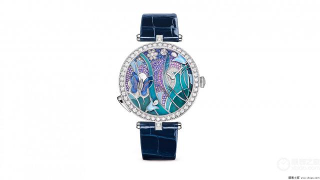 腕表点评:大自然向来是梵克雅宝的灵感缪斯,而蝴蝶更是世家钟爱的经典元素。这款 Lady Arpels Papillon Automate 腕表将蝶之灵动演绎得淋漓尽致:表盘之上,一只蝴蝶停驻在珍珠母贝雕刻的花朵间,随腕表动力变化轻振羽翼一至四下,宛如活物。蝶翼采用双色彩色玻璃珐琅打造,通透且富有灵性;周围植物以微绘珐琅装饰,部分草叶运用弧面珐琅呈现渐变蓝绿效果;表盘背景镶嵌蓝、紫等色调蓝宝石,似波光粼粼的水面。珐琅与宝石镶嵌交织出丰富层次,尽显世家匠心。腕表搭载 Valfleurier 机芯厂打造的自动上链机芯,动力储存 34 小时,更配备随机自动人偶模块:未佩戴时蝶翼每 2-4 分钟轻舞,佩戴后随活动节奏加快;按下左侧按钮,蝴蝶便拍翼呼应,将诗意与机械巧思完美融合。