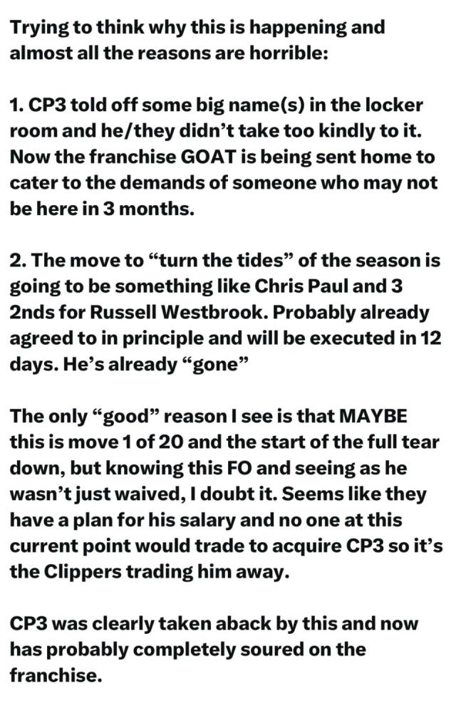 随后更震撼的交易消息流出,AP Hoops表示快船正推动用保罗加3个次轮选秀权交换拉塞尔-威斯布鲁克的方案。尽管威少本赛季在国王表现不错,但他和快船主帅泰伦-卢及部分球员的旧怨仍是潜在问题。