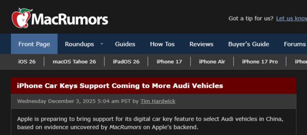 在2025年的苹果全球开发者大会上,苹果曾确认有13个汽车品牌“很快”会新增对数字车钥匙的支持,奥迪便是其中之一。其他品牌还包括讴歌、保时捷、GMC、凯迪拉克、雪佛兰、Rivian、Smart、Lucid Motors、塔塔汽车、红旗、魏牌、奇瑞以及岚图。此次一汽奥迪的接入,表明苹果在中国市场的汽车生态整合正在不断推进。