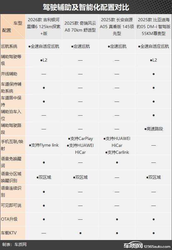 智能化上,吉利银河星耀6表现最全面,主流功能都有,但作为唯一不支持车载KTV的车型,有点遗憾;奇瑞风云A8智能化水平较差,连常见的OTA升级都没有,整体处于下风。