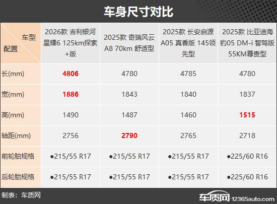 车身尺寸上,吉利银河星耀6的车长和车宽领先,让外观更显大气;奇瑞风云A8轴距最长,能提供更宽敞的后排空间;比亚迪海豹05 DM-i车身较高,头部空间更充足。长安启源A05尺寸数据虽不突出,但整体均衡,也能保证舒适的座舱空间。