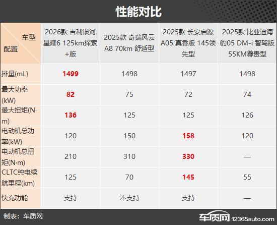 性能上,四款车都搭载1.5L自然吸气发动机加单电机的插电混动系统。吉利银河星耀6的发动机参数最突出,长安启源A05电动机参数占优,且CLTC纯电续航最长,能减少补能次数,降低用车成本。另外,这两款车都支持快充,充电效率领先。