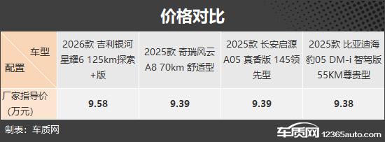 本次推荐的四款车型为吉利银河星耀6、奇瑞风云A8、长安启源A05和比亚迪海豹05 DM-i。它们的售价相近,既有新推出的车型,也有市场口碑较好的经典款,展现了当前该级别车型的主流产品实力(因图片数量有限,部分车型图片为示意图,仅供参考)。