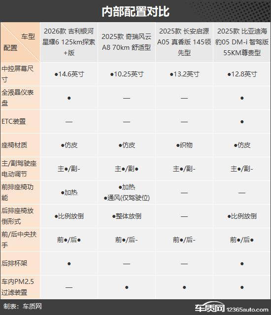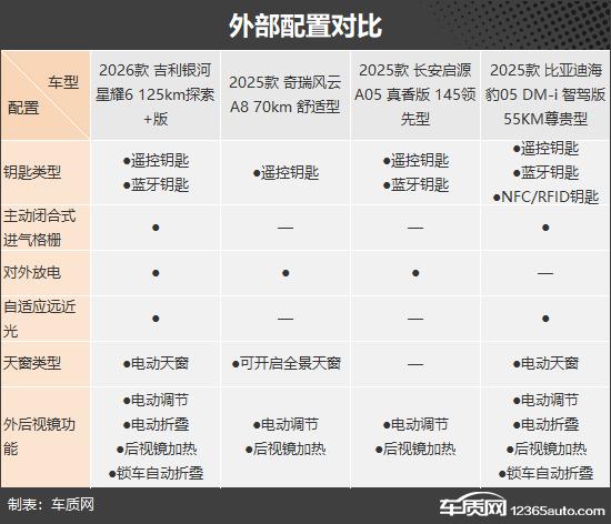 外部配置对比中,吉利银河星耀6配置最丰富;比亚迪海豹05 DM-i虽无对外放电功能,但唯一支持NFC/RFID钥匙;奇瑞风云A8的优势是可开启全景天窗;长安启源A05配置相对普通,缺乏亮点。