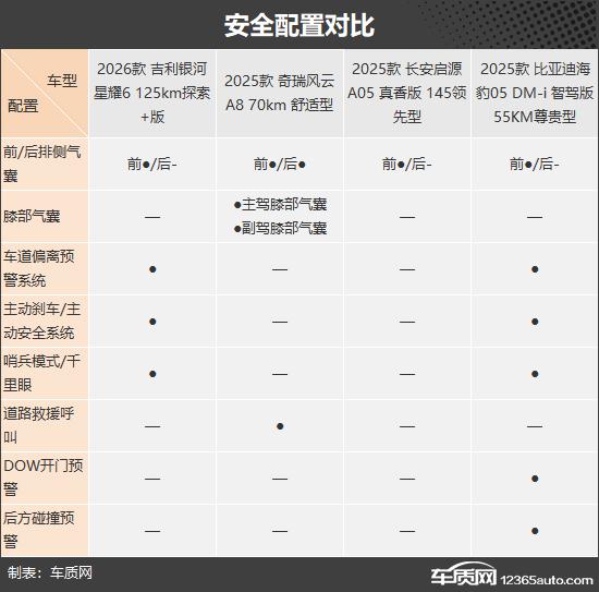 安全配置上,比亚迪海豹05 DM-i最全面,主动安全配置丰富,有主动刹车/主动安全系统、哨兵模式/千里眼等。奇瑞风云A8的优势在被动安全,是唯一配备后排侧气囊和主副驾膝部气囊的车型,主动安全方面还有道路救援呼叫功能。长安启源A05表现较差,主被动安全配置缺失较多。
