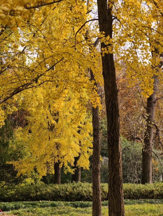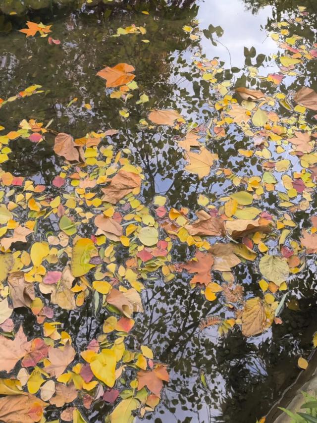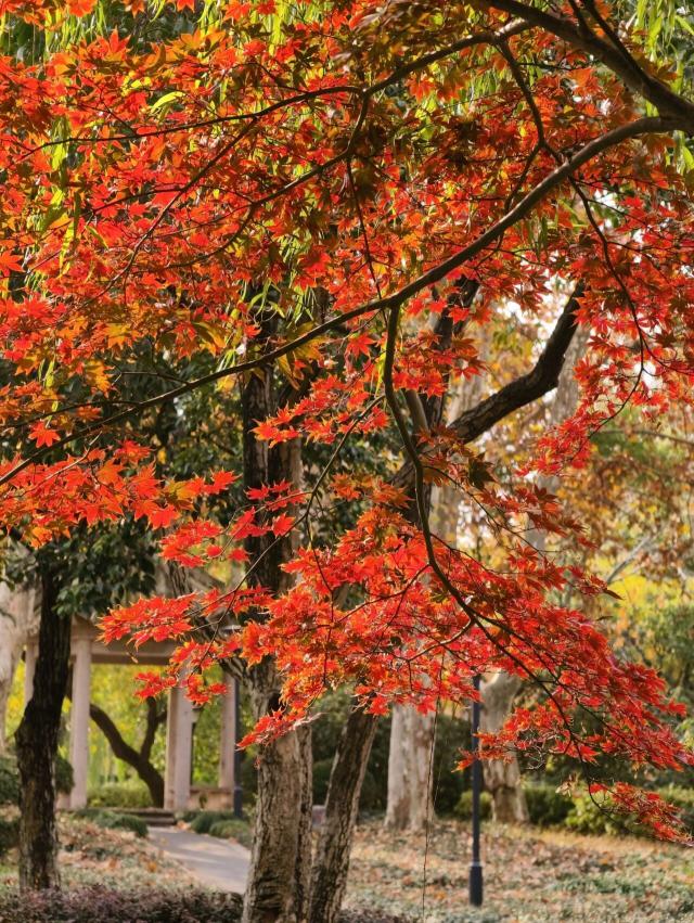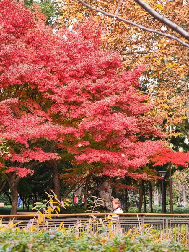 除了红枫,园内如今亦是色彩交织的斑斓世界:无患子明黄清透,乌桕浅绛点缀,银杏如金箔铺洒,水杉晕染锈红,悬铃木遍染暖褐……仿佛大自然打翻了调色盘,将万般色彩都倾洒于此。