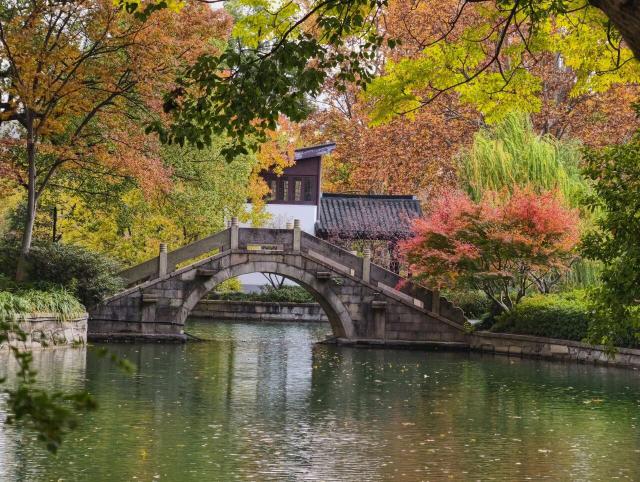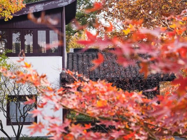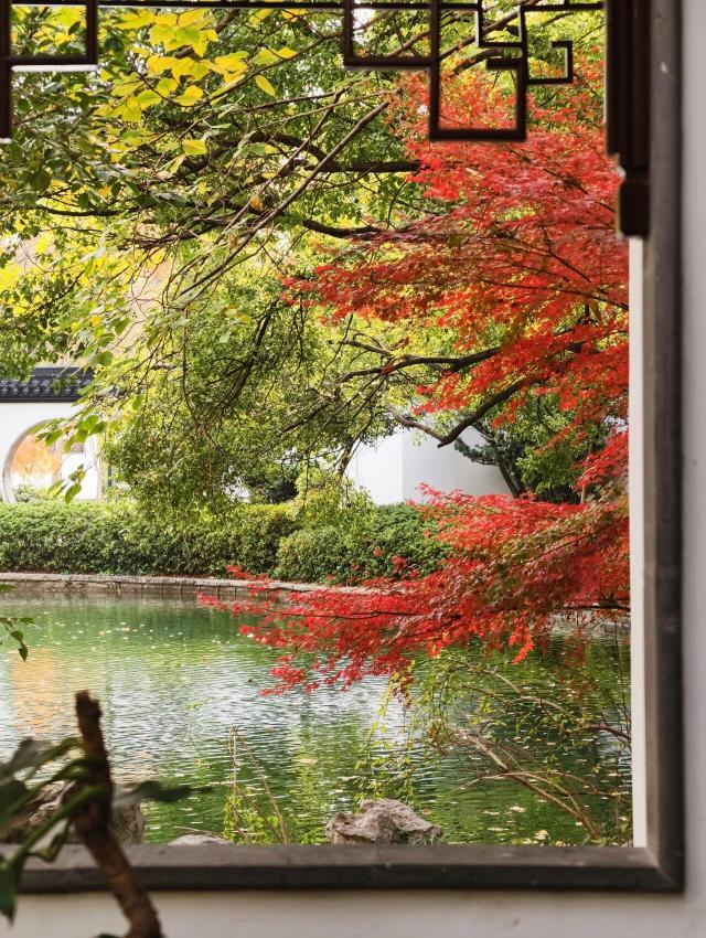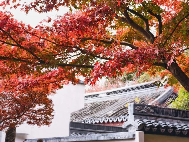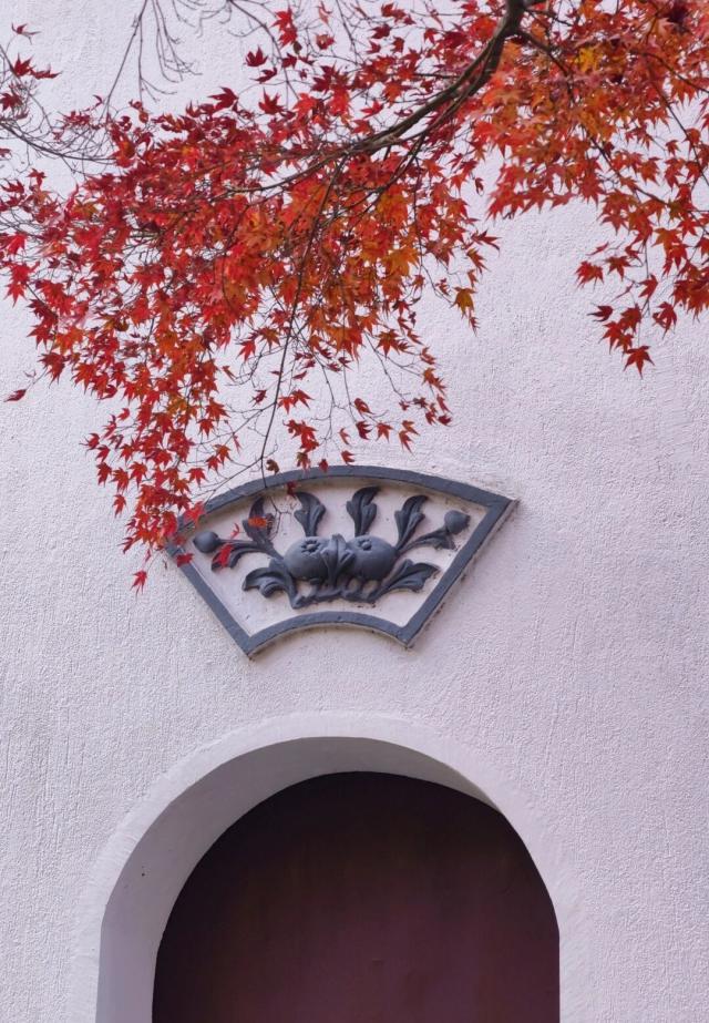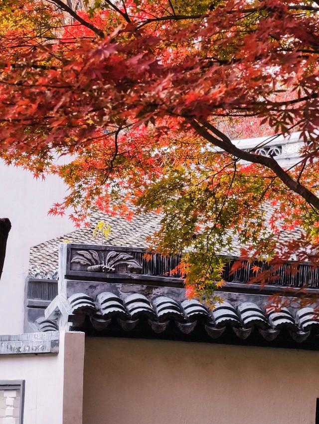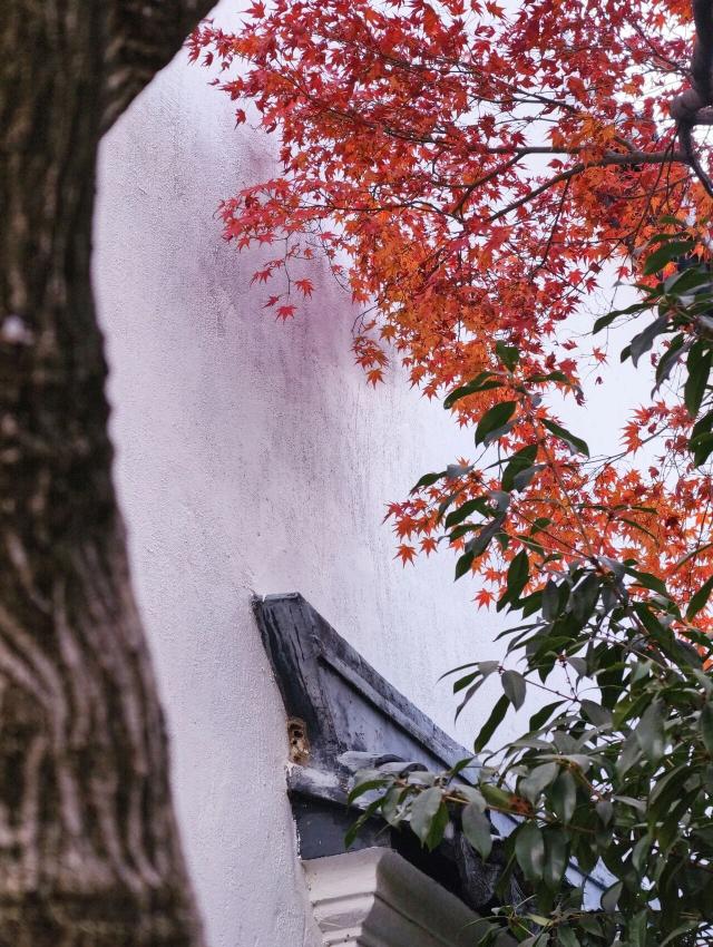 素净的白墙似天然宣纸,艳红的枫叶如灵动笔墨。临水而建的亭台、蜿蜒曲折的小径,这里没有喧嚣的人潮,唯有风过房檐、落叶敲阶的细碎声响,每一步都像踏入了一幅被时光温柔珍藏的古典园林画卷。