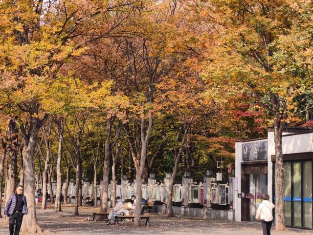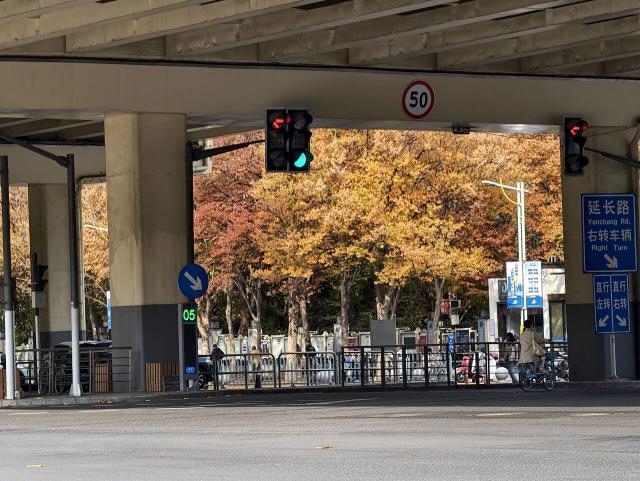 公园门外的榉树广场更是惊艳——粗壮的榉树撑开漫天斑斓的枝叶,将一旁的高架路化作天然画框,框住这幅动人的自然图景。