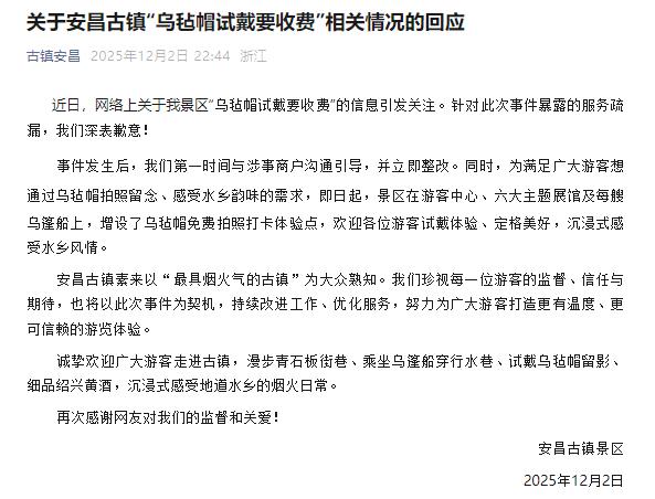 安昌古镇就乌毡帽试戴收费事件致歉并推出免费体验措施