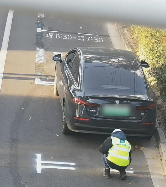 辅警立即向带班民警汇报情况。民警调取公共视频监控回溯核查,锁定了违规行为过程:一名身着反光背心、头戴安全帽的男子携带白色喷漆来到该地点,私自喷涂划定两个车位,随后将自己驾驶的车辆停入其中一个自划车位后离开。