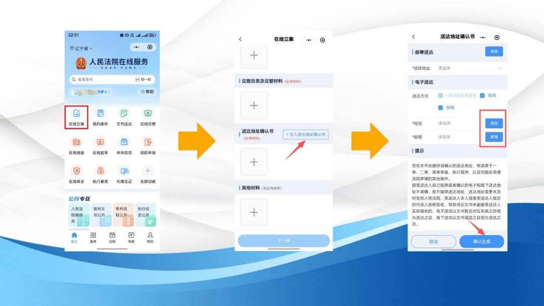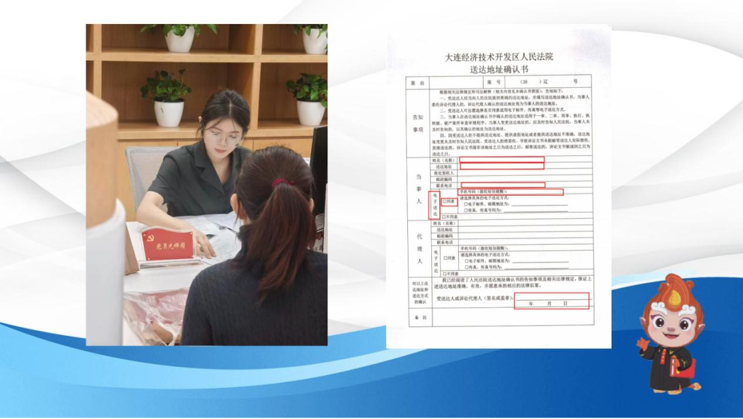 在线下立案时,您可以在诉讼服务人员的指导下填写送达地址确认书,并挑选适合自己的电子送达方式。