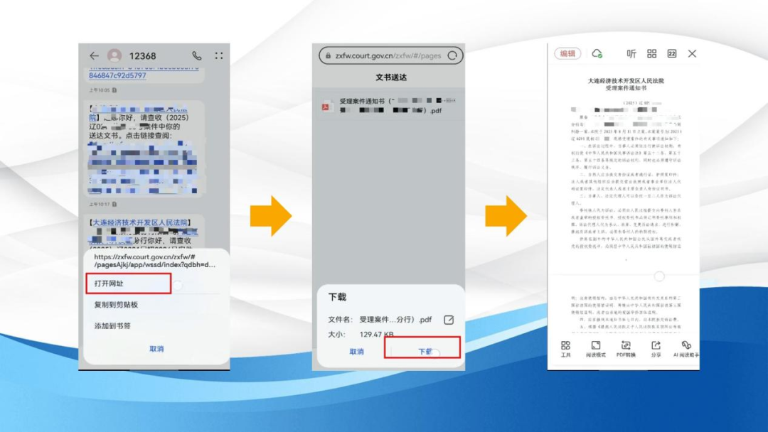 以选择手机短信送达为例,法院端把送达文书推送到当事人或代理人同意接收送达的手机号码后,您会收到12368发送的短信。根据短信内容,点击链接查阅,选择打开网址。点击显示的送达文书名称,选择下载,就可以将文书保存到手机里查看。