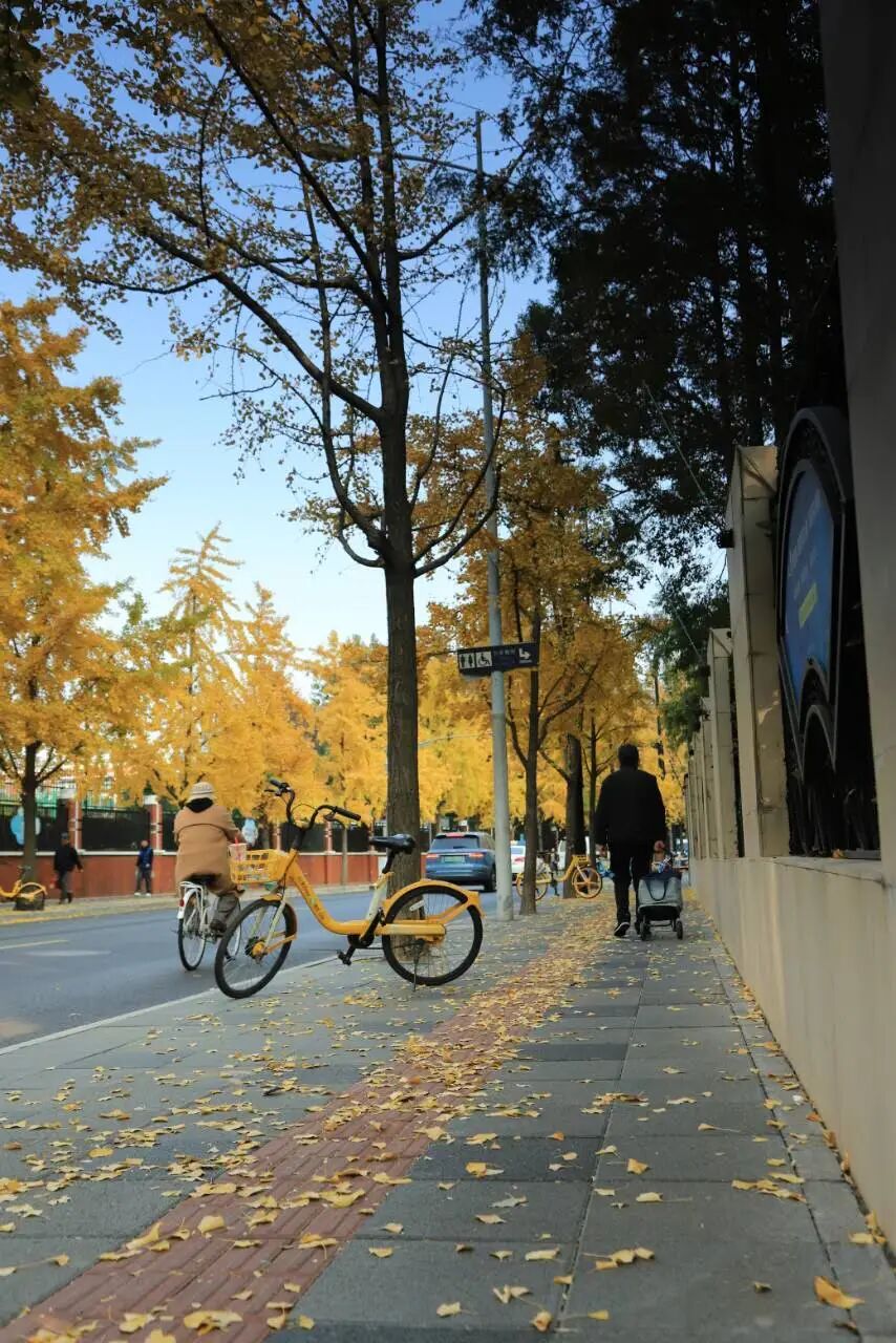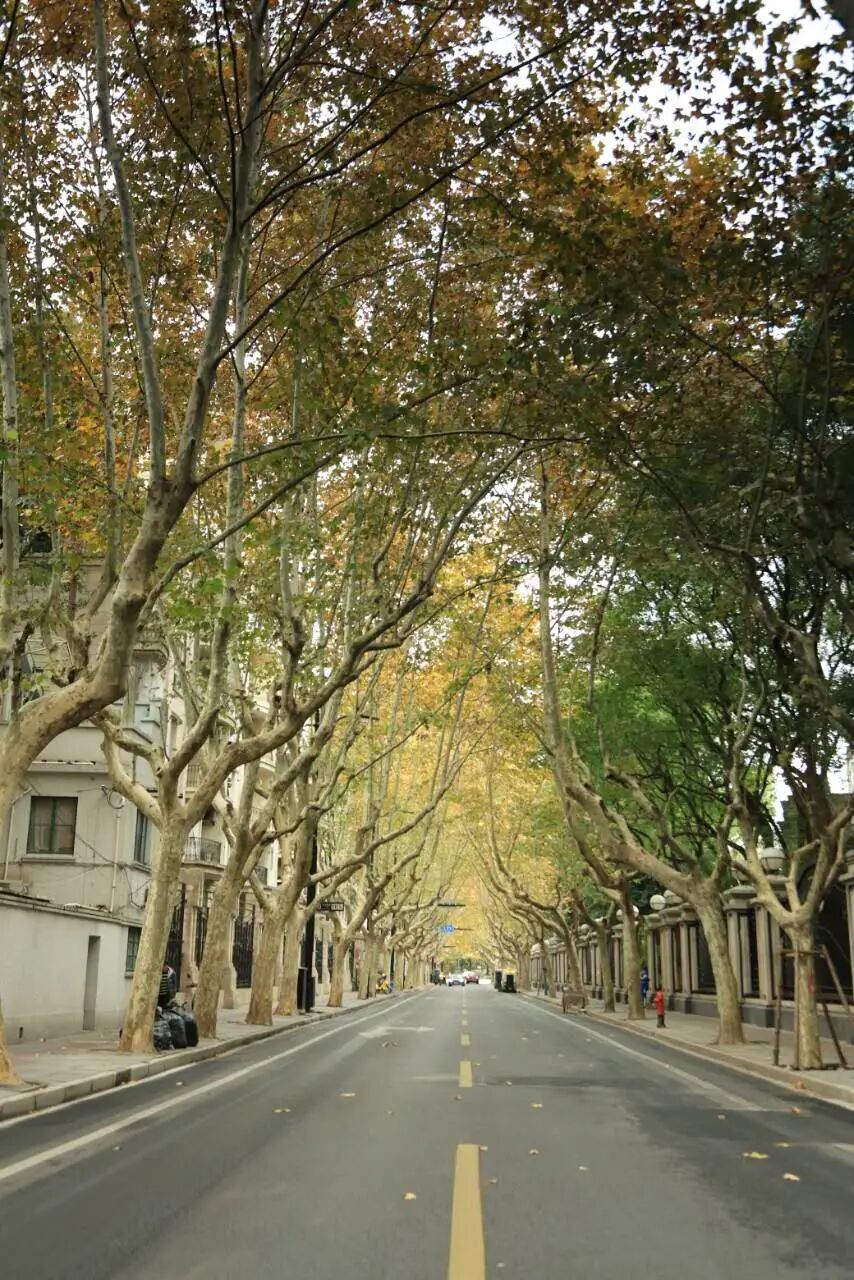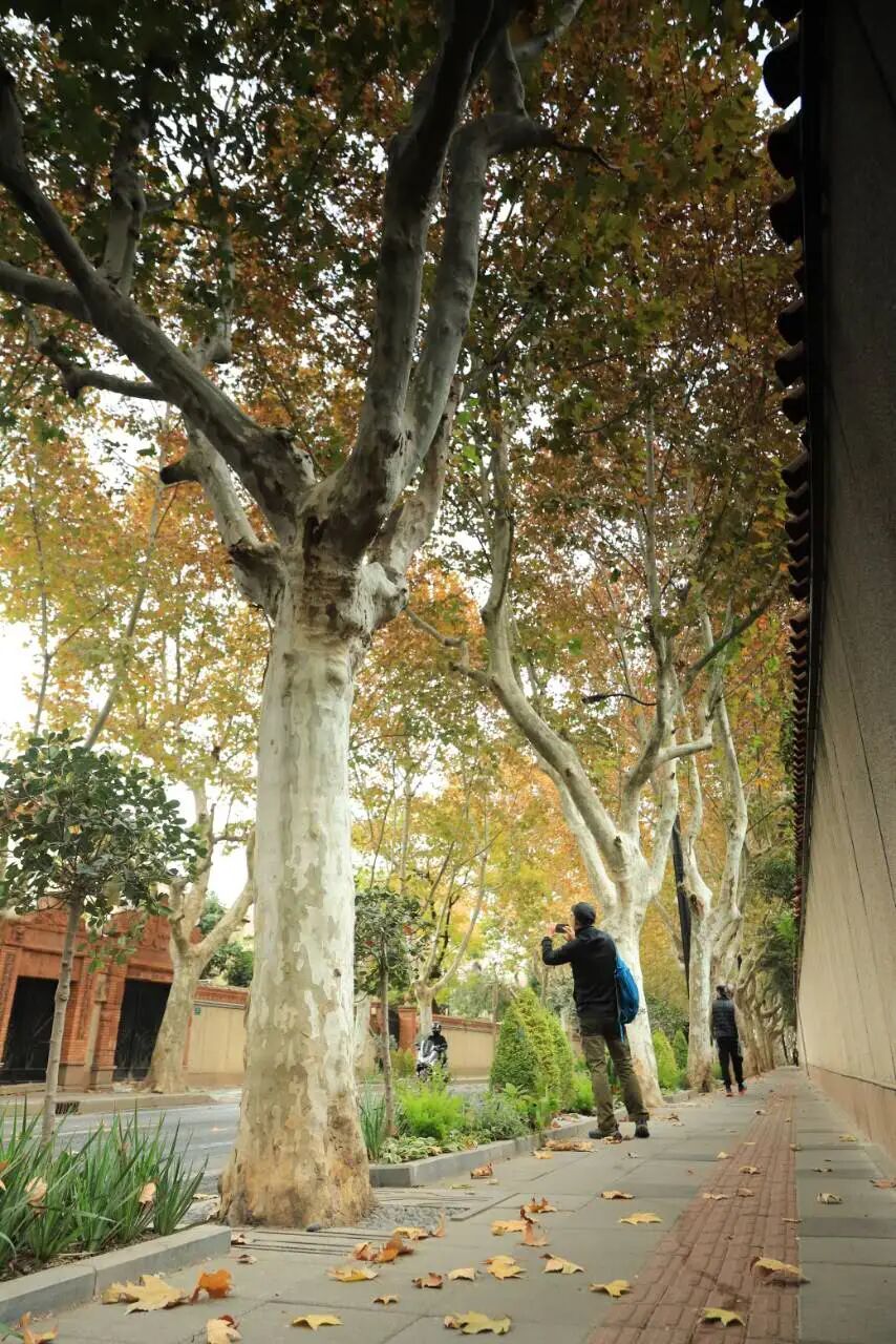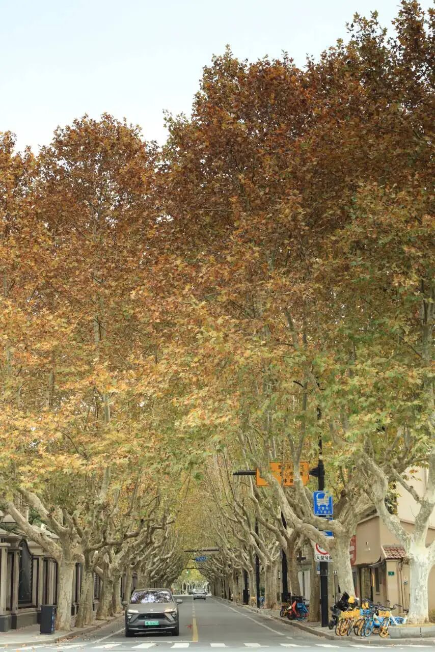 泰安路同样以悬铃木为主题,树木更茂密,落叶堆积出丰富层次。阳光透过枝叶洒在金黄地毯上,整条街笼罩柔和光影,形成沉浸感秋景长廊。漫步或留影,都能感受落叶与街道交融的静谧之美。