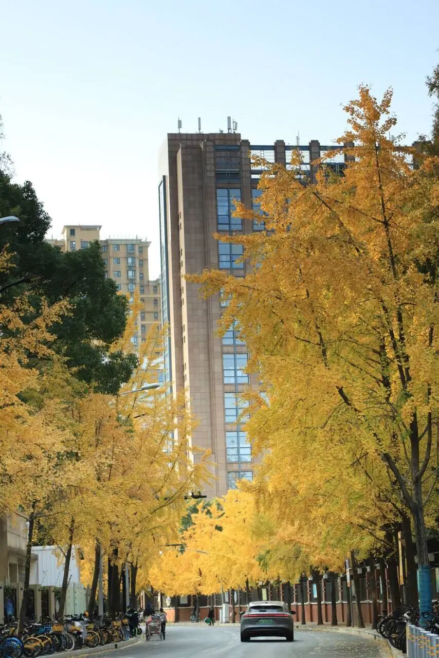 毗邻学校的天中路,秋意别具温情。银杏树洒下扇叶落在红墙边,朱红与金黄交织出温婉明亮的校园风光。落叶堆叠,青春气息与季节诗意融合,成长宁秋季格外柔和的风景。