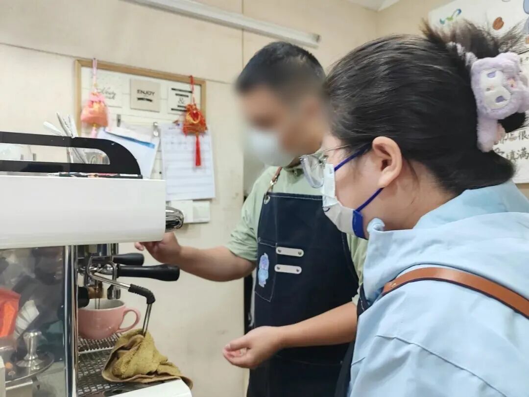 清晨薄雾散尽,阳光洒满大地时,小宇和小杰已轻快地来到咖啡吧。他们仔细清洁地面、检查设备、补齐原料,每个环节都一丝不苟。8点半后订单渐多,小宇在指导老师黄圣坤的提醒下调整奶泡手法,一杯拉花咖啡便温暖出炉,随后他认真送餐上门。