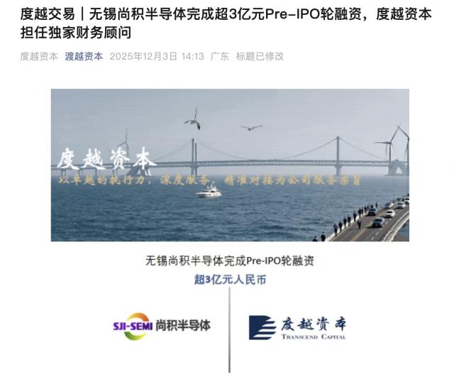 瑞财经 吴文婷 12月3日消息,据度越资本披露,无锡尚积半导体科技股份有限公司(简称“尚积半导体”)已顺利完成超3亿元的Pre-IPO轮融资。