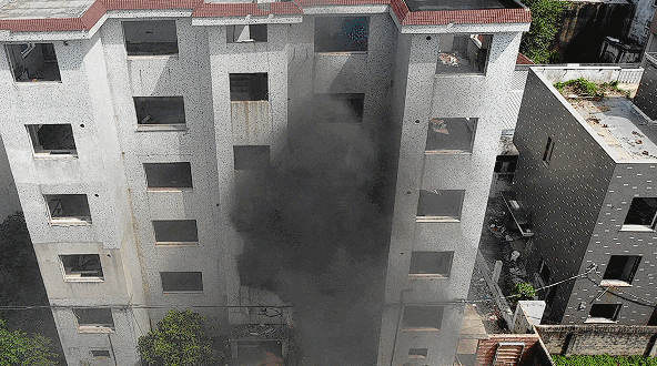 此前,消防员在两栋待拆迁居民楼内开展了一场新旧国标电动自行车燃烧实验