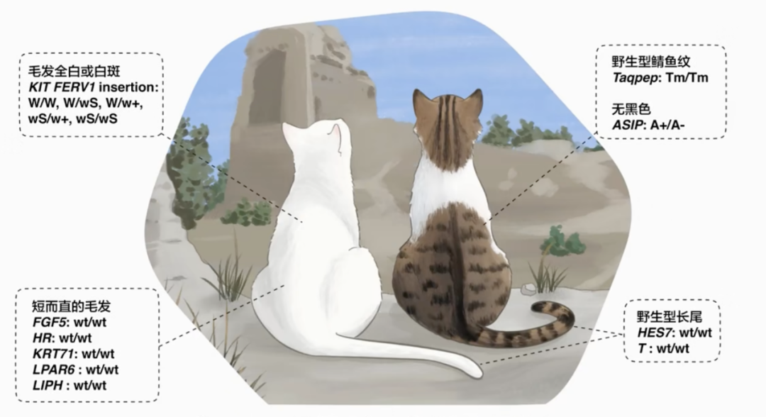 基因组分析还原了陕西靖边统万城遗址出土的中国目前已知最古老家猫的外观:一只纯白或带有白斑的狸花公猫,短毛长尾,且不携带现代家猫常见的遗传缺陷。