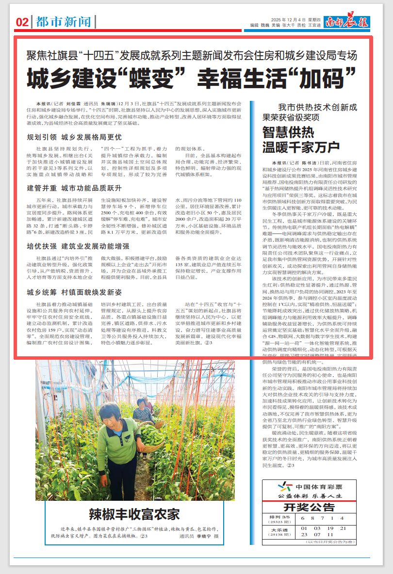 12月3日,社旗县“十四五”发展成就系列主题新闻发布会住房和城乡建设局专场顺利召开。“十四五”期间,社旗县始终秉持以人民为中心的发展理念,扎实推进城市更新,深化城乡融合发展,在空间布局优化、城市功能完善、产业转型推动、人居环境改善等领域成果丰硕,为县域经济社会高质量发展筑牢根基。