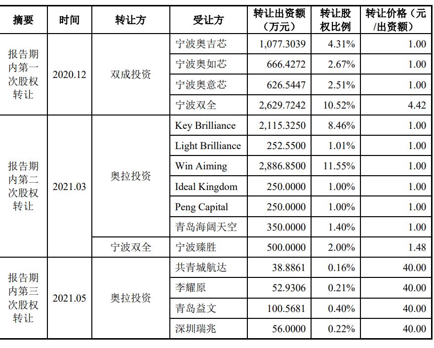 奥拉半导体的估值曾在短时间内飙升。根据其此前科创板IPO招股书,2021年5月至6月的第三次、第四次股权转让中,外部投资者受让价格达40元/出资额,对应估值100亿元。而在此两个月前,该公司股权价格仅为此次转让价的三十分之一甚至四十分之一。