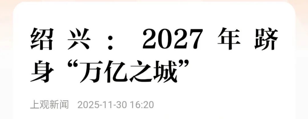 无独有偶,2025绍兴发展大会上传出消息,今年绍兴GDP将突破9000亿元,计划到2027年成功跻身GDP“万亿之城”行列。