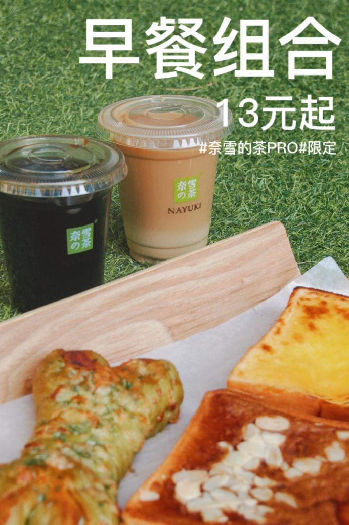 奈雪的茶很早就以“茶饮+烘焙”为标准搭配,2020年4月就开始发力早餐产品,当时在少数深圳门店推出纯茶/咖啡搭配三明治的组合,其中一款还使用植物肉。