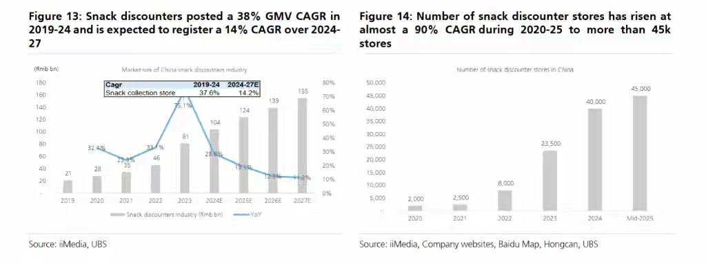 新模式在需求与规模层面同步冲击三只松鼠。艾媒咨询数据显示,2019 - 2024年零食折扣店销售额复合年增长率达38%,瑞银预测2024 - 2027年将继续以14%的复合年增长率增长,未来门店总数有望突破7万家。