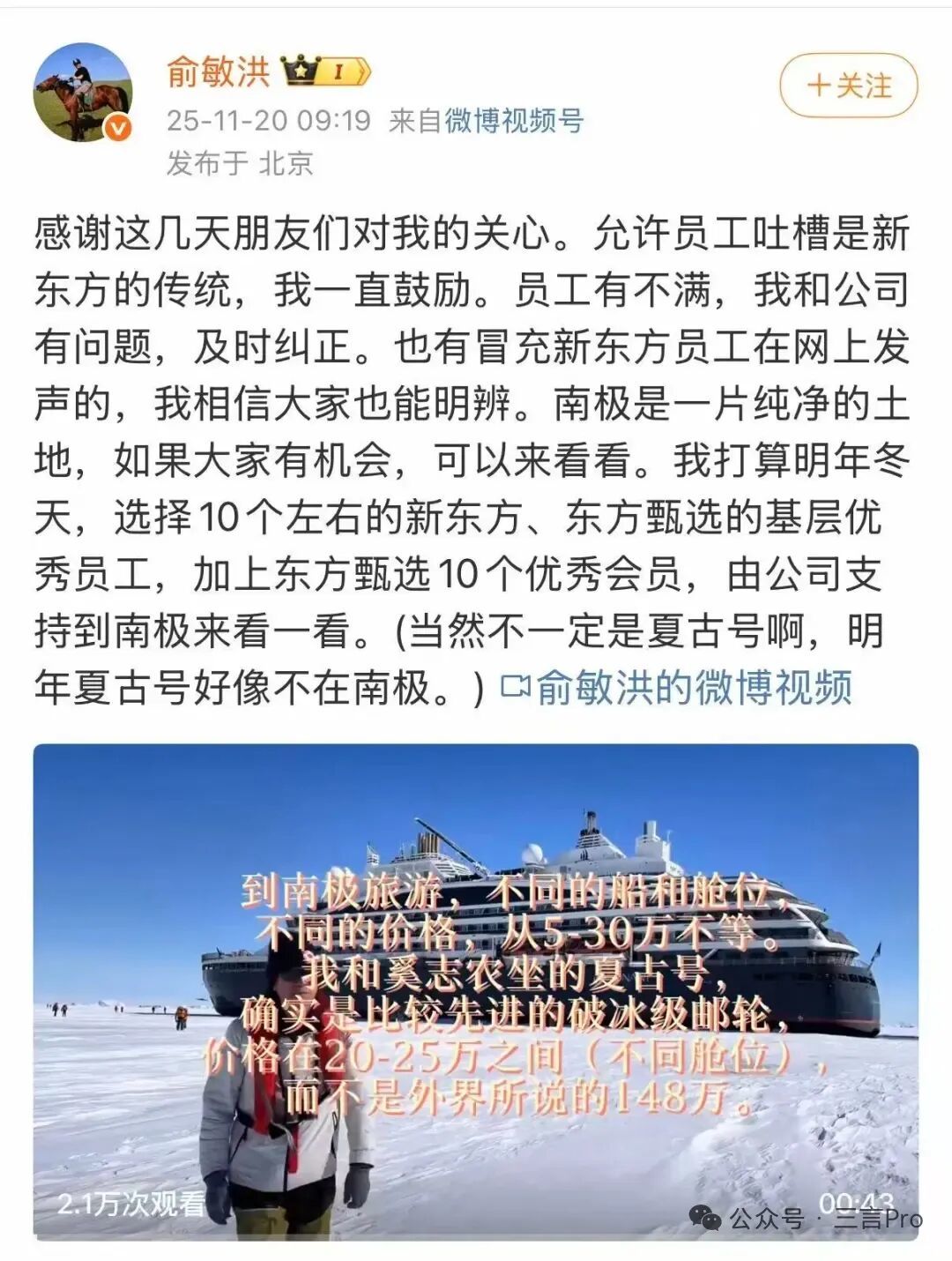 11月20日,新东方创始人俞敏洪在社交媒体上回应了关于他南极之行的争议。
