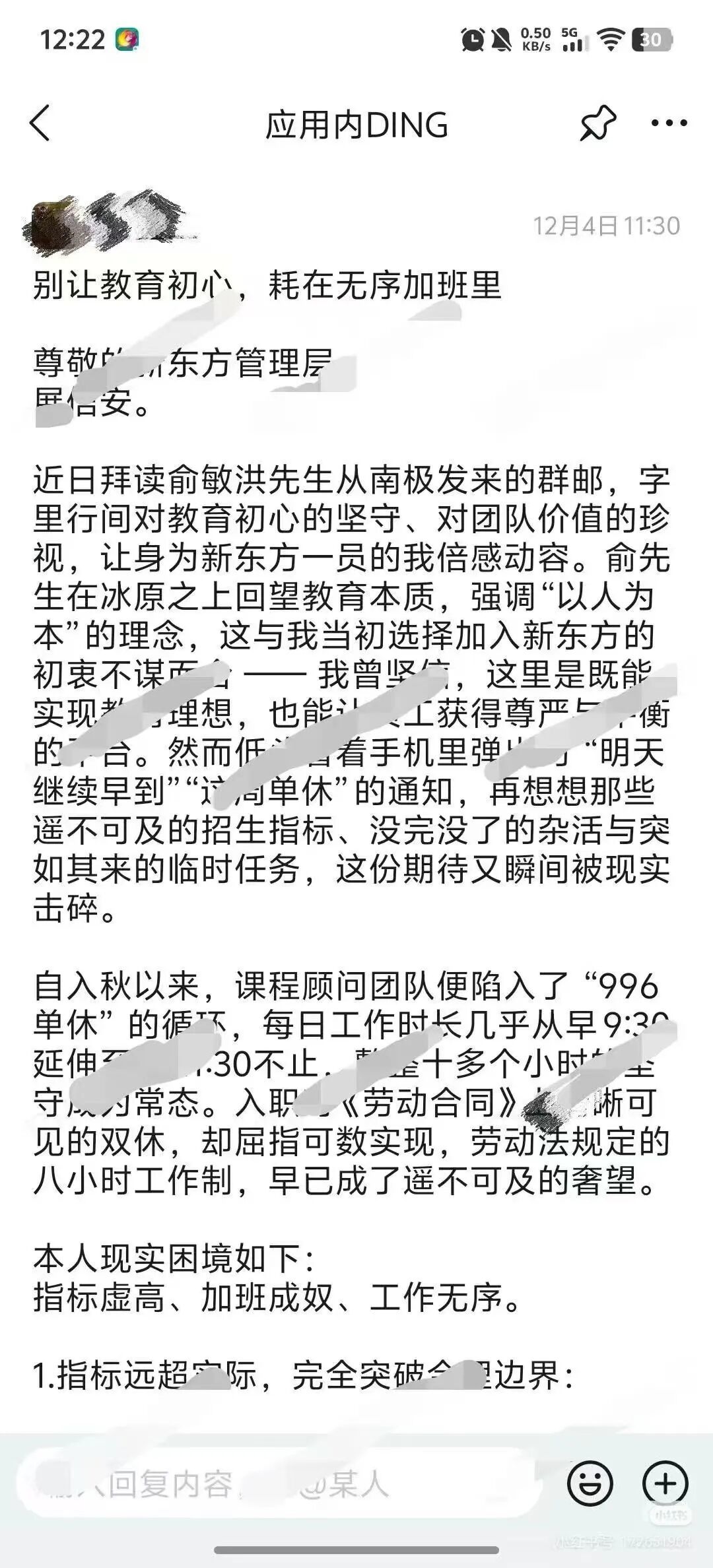 12月4日,网络上流传出一名新东方员工通过内部邮件表达对公司加班文化不满的消息,该员工呼吁管理层尊重员工的基本劳动权益。