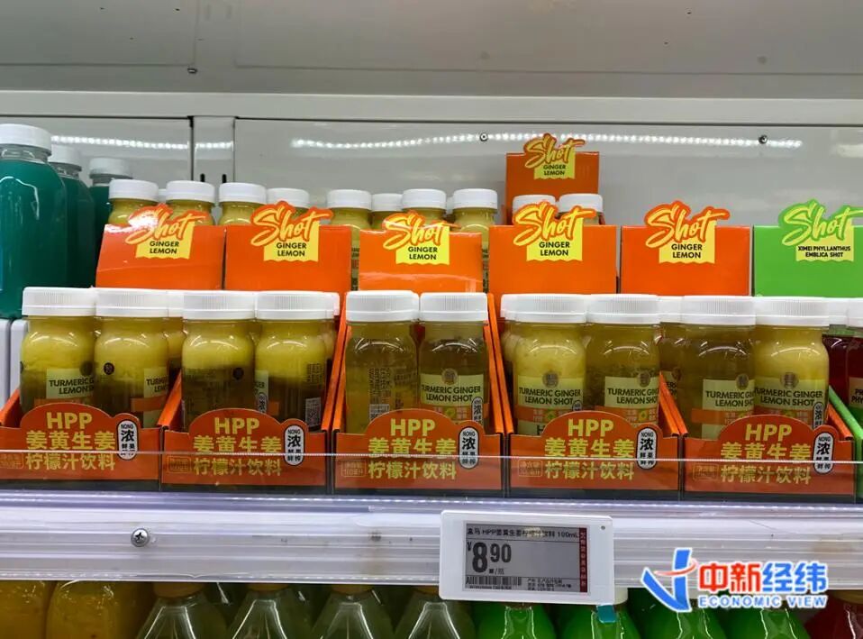 11月26日,在盒马一家线下门店里,HPP姜黄生姜柠檬汁饮料被摆放在货架最上方。一瓶100ml的该饮料售价8.9元,比旁边同样100ml的HPP西梅油柑益生元饮料价格更高。