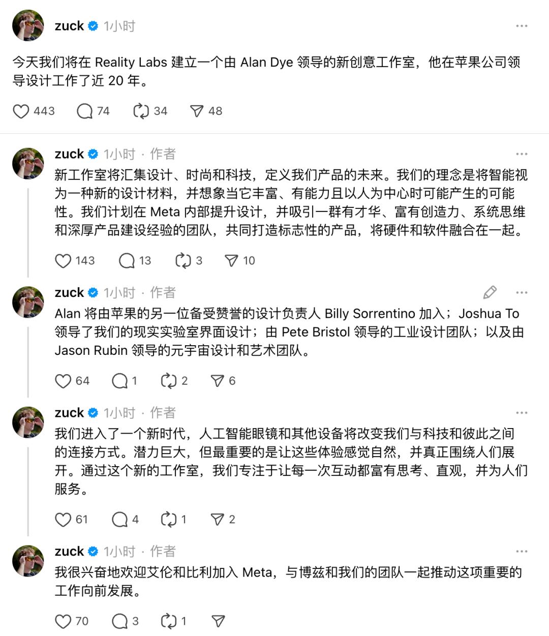但问题是,与讲究精雕细琢、追求极致的苹果产品相比,Meta的产品虽然能用,但总是缺少一些亮点。所以这次挖来Dye,扎克伯格显然是想弥补这一短板。