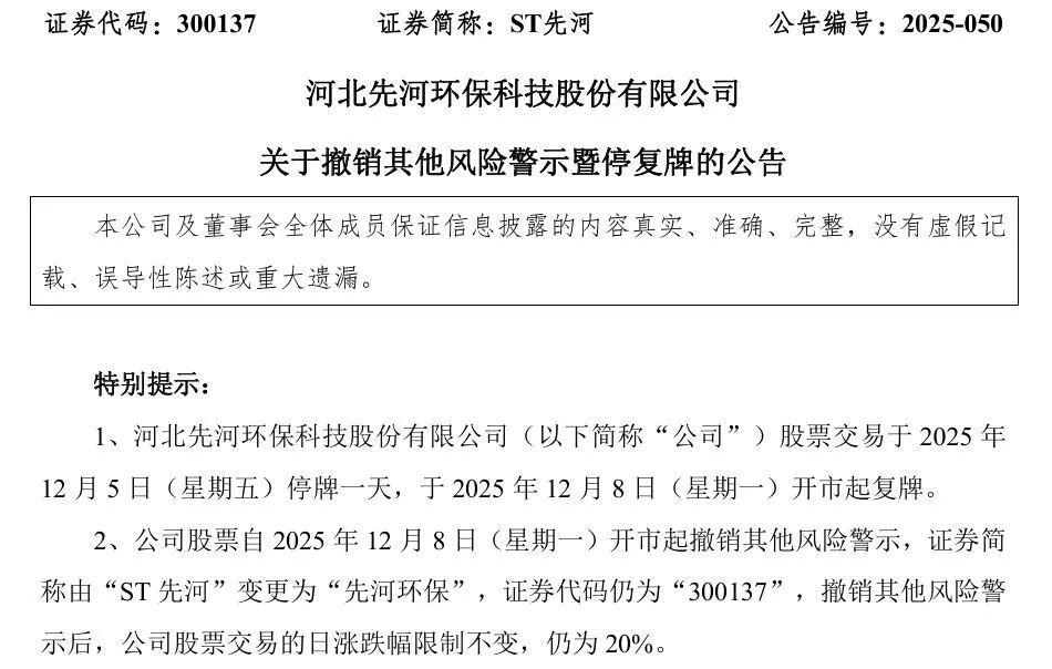 公告指出,公司股票交易将于2025年12月5日(星期五)停牌一天,并于2025年12月8日(星期一)开市起复牌。自2025年12月8日(星期一)开市起,公司股票撤销其他风险警示,证券简称由“ST先河”恢复为“先河环保”,证券代码保持“300137”不变。撤销其他风险警示后,公司股票交易的日涨跌幅限制仍为20%,未发生变化。