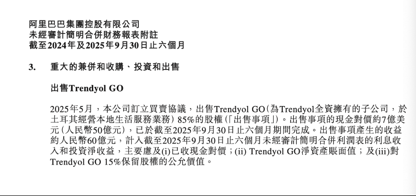 阿里巴巴2026财年中期报告显示,2025年5月,公司出售土耳其即时配送品牌Trendyol GO 85%股权,现金对价约7亿美元(折合人民币约60亿元),交易已于2025年9月30日前完成,收益计入同期投资净收益。Trendyol GO是土耳其电商巨头Trendyol旗下品牌,主打分钟级生鲜配送,阿里曾通过多轮投资持股超86%,此次出售后其归入Uber土耳其业务板块。