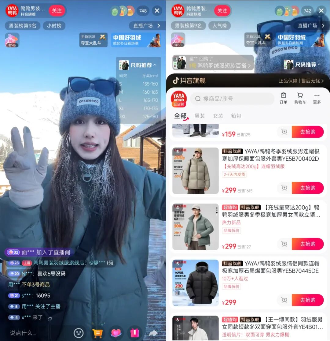另一种营销打法是场景竞争:当户外博主穿着上万元的始祖鸟、加拿大鹅穿越雪山时,平价羽绒服品牌也把直播间搬到了户外。鸭鸭将直播间设在零下14℃的冰天雪地,用极限场景直观告诉观众:我的抗冻性能不输专业户外品牌,但价格仅为它们的十分之一甚至二十分之一,性价比肉眼可见。