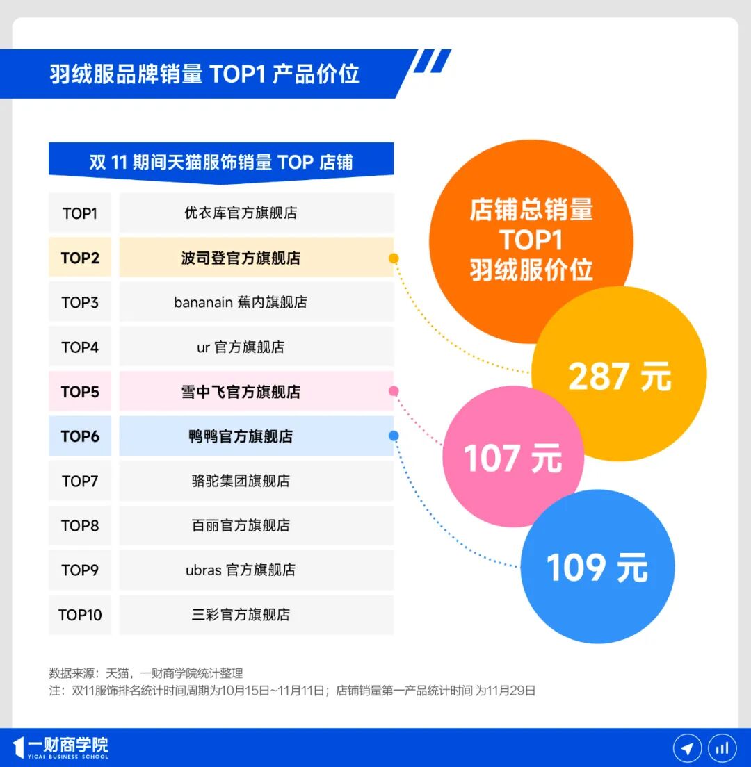 打开淘宝可见,销量前五的羽绒服爆款中,有三件价格低于300元。天猫双11服饰销量排行榜上,波司登、雪中飞、鸭鸭这些专业羽绒服品牌,店内销量第一的单品均在300元以内。