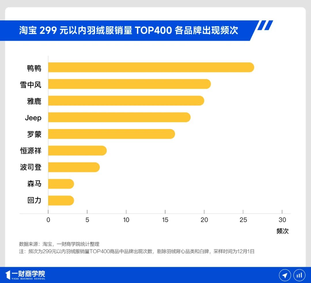 在淘宝筛选299元以下销量TOP400的羽绒服——剔除知名度低的“白牌”和羽绒背心后,会高频出现几个熟悉的品牌:鸭鸭、雪中飞、雅鹿,还有从户外领域跨界而来的Jeep。