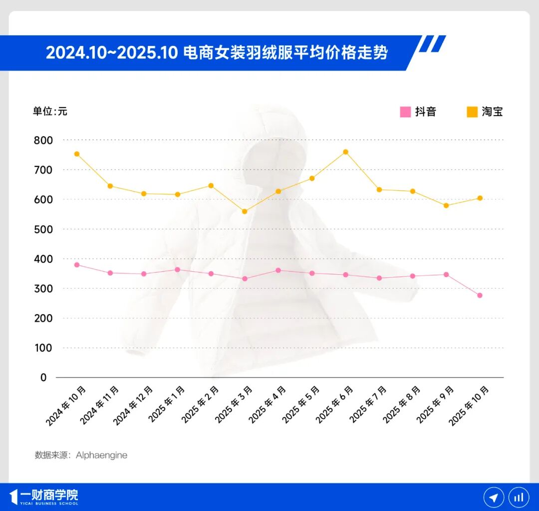 研究300元价格带时,还发现一个有趣现象:羽绒服客单价最高的月份,往往不是深冬,而是夏天。Alphaengine数据显示,2025年10月抖音、淘宝的女装羽绒服均价,较6月分别下滑21%和18.7%。