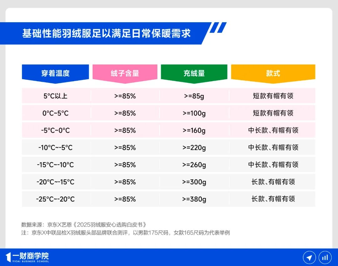 其一,多数人无需顶级保暖性能。中国约60%的人口居住在冬季平均气温0℃以上的南方,大部分消费者不会去户外攀登雪山,自然不需要应对极度严寒。京东与中联品检的测评显示,一件充绒量100g的短款羽绒服,足以应对0℃以上的天气,最多再搭配一件入门级中长款,就能满足多数人冬季的保暖刚需。按最新羽绒原料价格计算,其鸭绒原料成本不足百元。