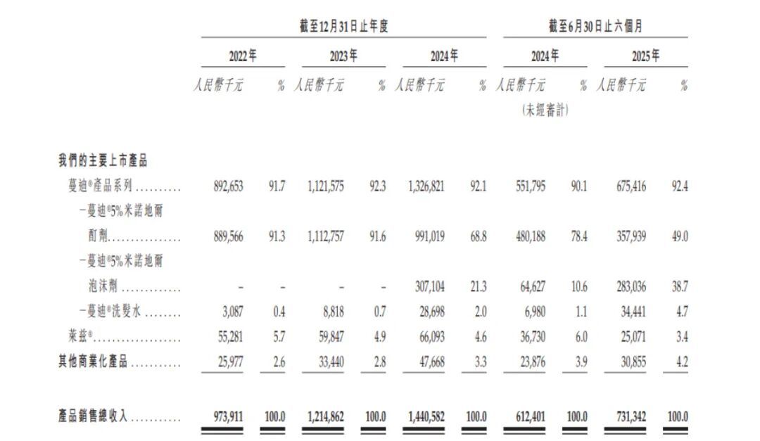 2022年至2025年上半年,蔓迪系列(米诺地尔系列)产品贡献了公司总收入的92%左右