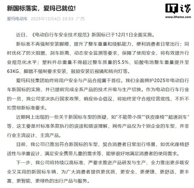 IT 之家 12 月 5 日消息,《电动自行车安全技术规范》新国标已于 12 月 1 日正式全面实施。近期网络上出现了一些针对新国标车型的质疑声音,比如“无法搭载儿童”“配备铁皮座椅”“超速时刹车性能不佳”等,爱玛电动车于今晚发布公告表示,这些质疑主要源于对标准条款执行的误解和错误解读,网传的相关问题车型仅仅是个别企业生产的产品,并非行业内的主流设计和主流产品。