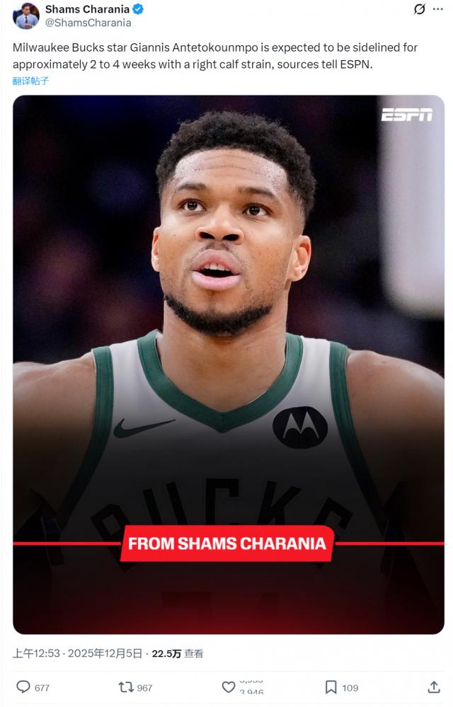 北京时间12月5日凌晨1点,据NBA知名记者Shams报道,雄鹿队球星字母哥因右小腿拉伤,预计将休战2至4周。在雄鹿对阵活塞的比赛中,开场仅3分钟字母哥就因伤退出赛场。国内外球迷纷纷猜测:雄鹿队此举或许是为了保护字母哥,避免他在潜在交易前再次受伤。