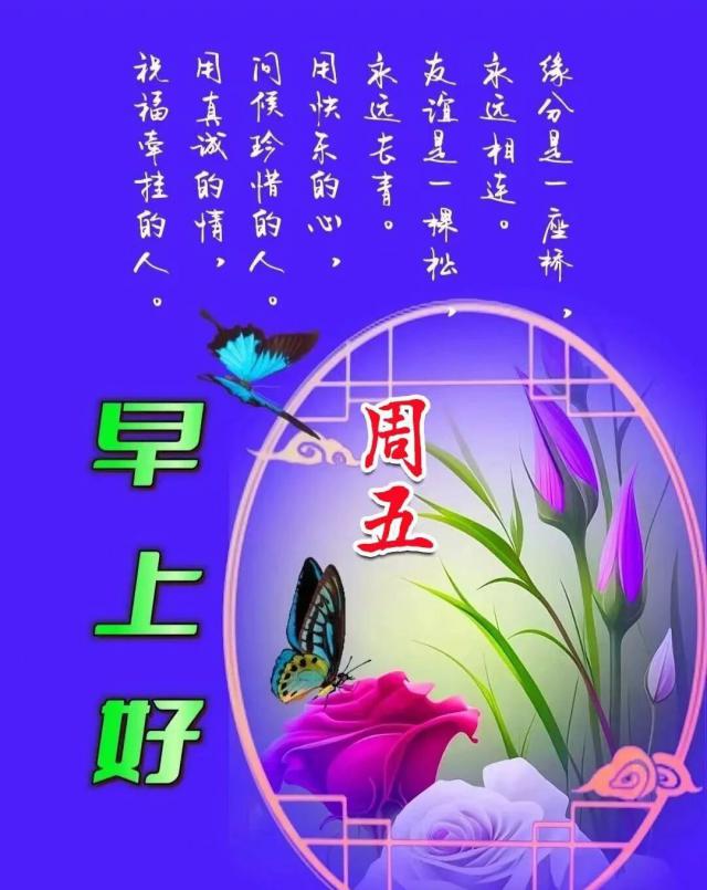早安!愿这个周五的你收获美丽与善良。用温暖的心对待他人,用善意的眼看待世界,给予帮助与支持的你,会成为他人生命里的光与港湾。