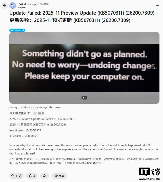 IT 之家引用该文章内容介绍,此次可选更新虽包含不少修复内容,但根据用户反馈,存在安装失败、深色模式下文件管理器突然闪白屏、登录界面“密码”图标消失以及驱动冲突导致黑屏或蓝屏死机等问题。