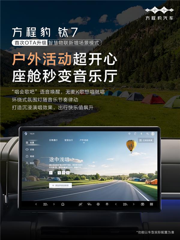 户外活动场景方面,新增了无麦K歌与氛围灯联动功能,用户在户外使用车辆时,无需麦克风即可通过车内音响系统进行K歌,同时氛围灯会根据音乐节奏自动变换色彩,为旅途增添更多乐趣,让户外活动更加丰富多彩。