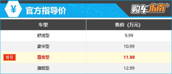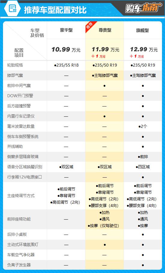 推荐尊贵型(11.99万元,限时抢鲜价11.29万元):相比低配置车型,升级19英寸轮毂,新增前排座椅加热/通风等实用配置,1万元差价带来更好体验,值得选择。