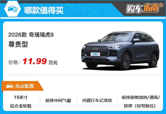 综上,2026款瑞虎8中11.99万元的尊贵型性价比最高,虎款/豹款按喜好选,优先考虑限时抢鲜价。